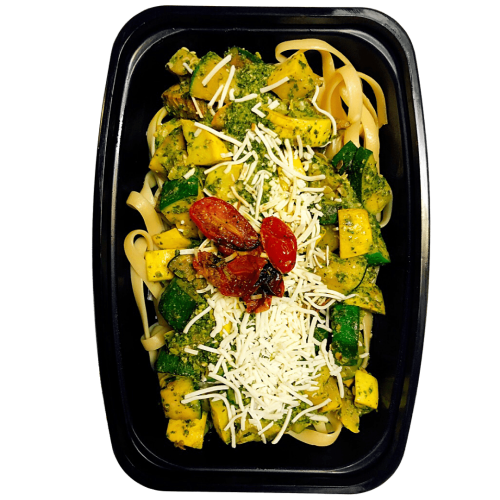 Seared chicken breasts coated with our basil pesto sauce paired with pasta noodles and cherry tomatoes.
