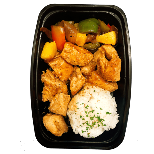 Get ready for this zesty, tangy Chinese dish without all the deep fried calories. Tenderized chunks of chicken with sticky Jazmine rice served with green and red bell peppers, yellow onion and pineapple.