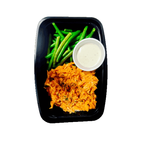 Seasoned and shredded chicken breast tossed in buffalo sauce, served with long green beans and with a side of ranch. For anyone looking to cut their carbohydrate intake, this delicious meal is sure to please.