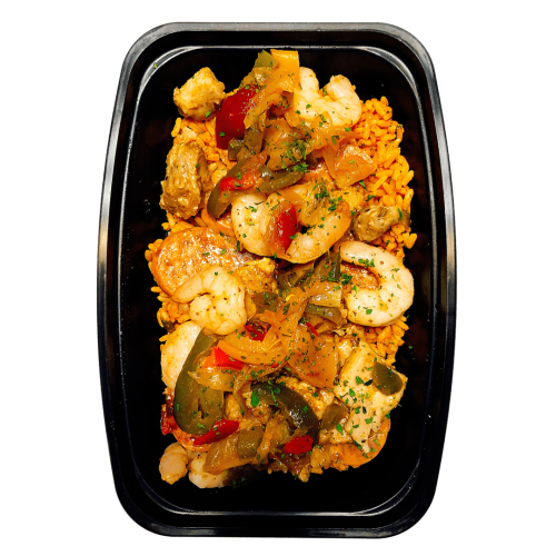 Ingredients: Shrimp, chicken, sausage, brown rice, green bell peppers, red bell peppers, green beans and onions.