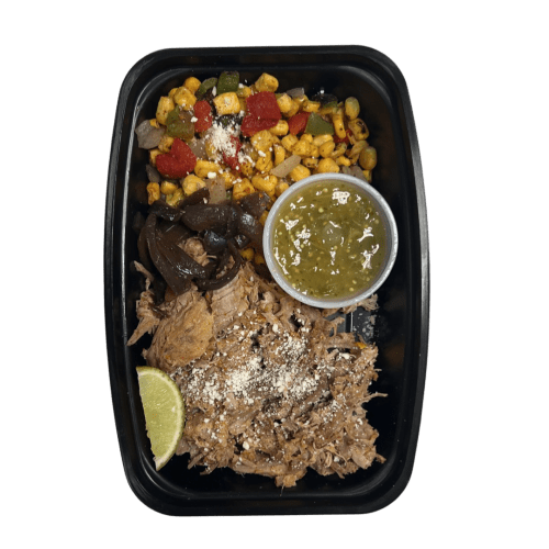 Juicy slow roasted shredded pork topped with a sprinkle of cotija cheese, paired with fire roasted corn, poblano peppers, red bell peppers, yellow onion, and a side of salsa verde.