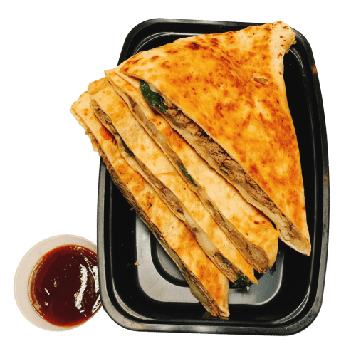 BBQ chicken with green onions, caramelized red onions, and cheddar jack cheese melted in a crispy tortilla served with a side of salsa.