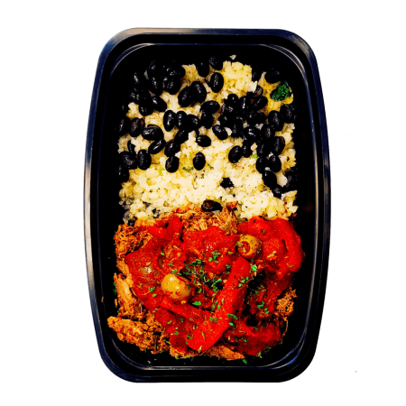 A delicious dish made from shredded lean beef that's been stewed with vegetables in a richly spiced tomato base.Paired with cauliflower rice, black beans, bell peppers, onions, and olives.