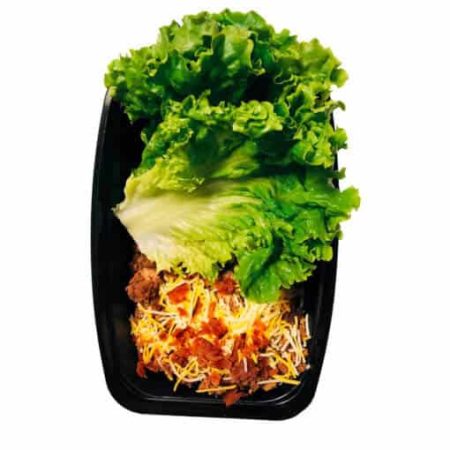 Ingredients: lean ground beef, bacon, cheddar jack cheese, lettuce, diced tomato, green chiles, ranch dressing