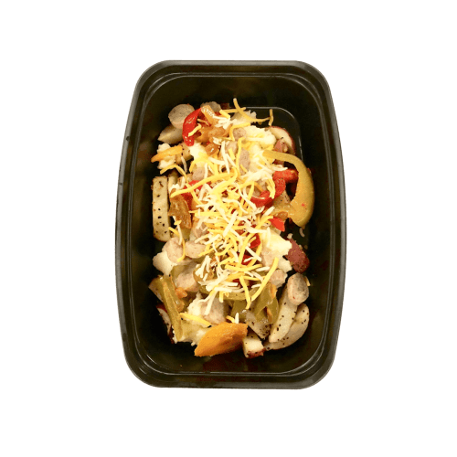 Creamy scrambled eggs mixed with sautéed bell peppers and onions with perfectly seasoned red potatoes topped with cheddar jack cheese and delicious turkey sausage on the side. This hearty breakfast will help you conquer the day ahead.