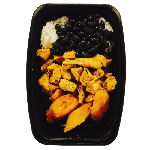 Marinated and seasoned Caribbean jerk chicken paired with black beans, jasmine rice, and plantains.
