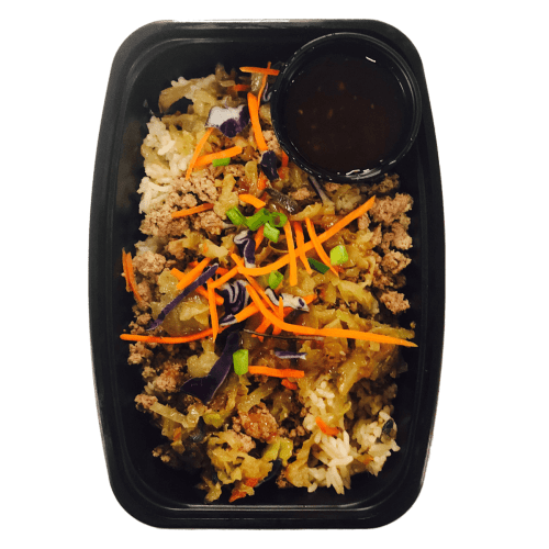 Ingredients: Lean ground turkey, jasmine rice, cabbage, carrots, green onions, and sweet chili sauce