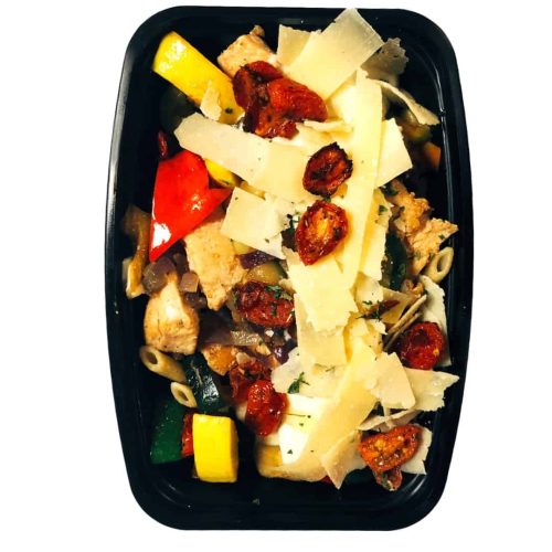 Ingredients: Chicken, whole grain pasta, pesto, cherry tomatoes, and parmesan cheese.