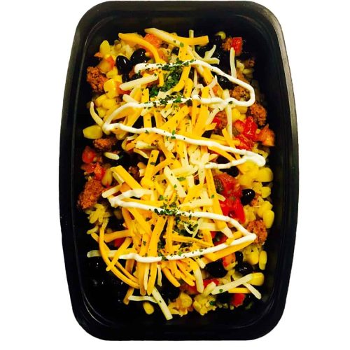Ingredients: Lean ground beef, brown rice, black beans, corn, pico de Gallo, cheddar jack cheese, low fat sour cream, and taco seasoning.
