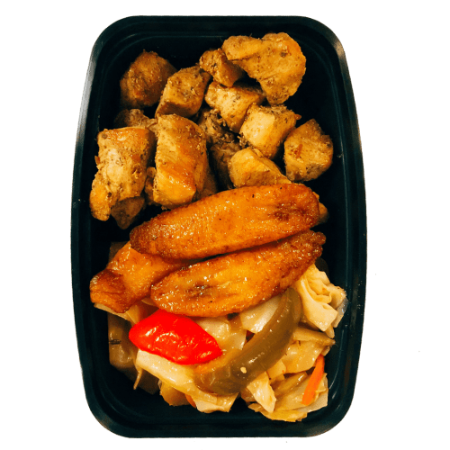 Marinated and seasoned Caribbean jerk chicken paired with a Jamaican style cabbage and plantains.