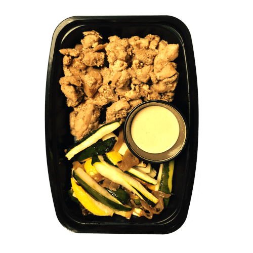 Hibachi chicken breast served with a side of zucchini, squash, and onions. Served with a low fat, guilt-free yum yum sauce.