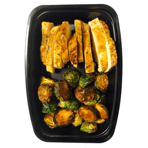 Lemon pepper grilled chicken breast paired with green cabbage & roasted brussel sprouts