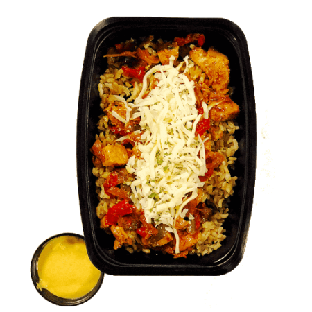 Sauteed chicken mixed with peppers and onions served with brown rice and topped with low fat mozzarella cheese.