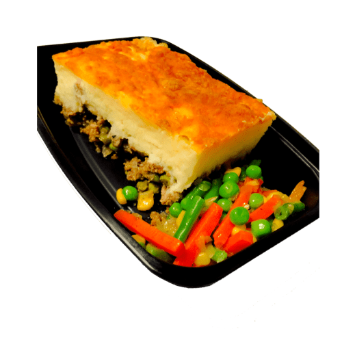 Ingredients: Yukon potatoes, lean ground beef, carrots, corn, peas, cheddar jack cheese and onions