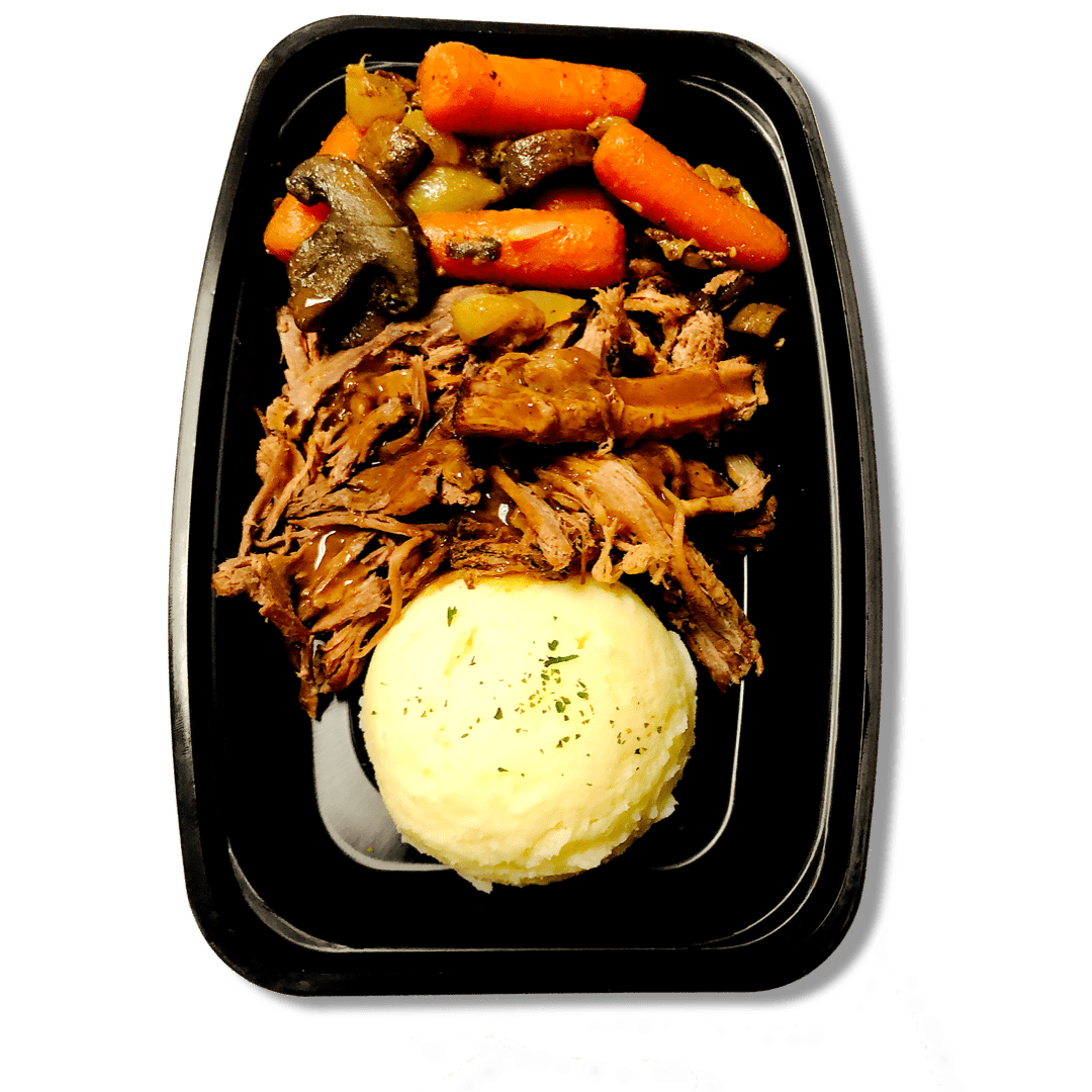 Beef slow roasted in our burgundy sauce paired with mashed potatoes, carrots and pearl onions.