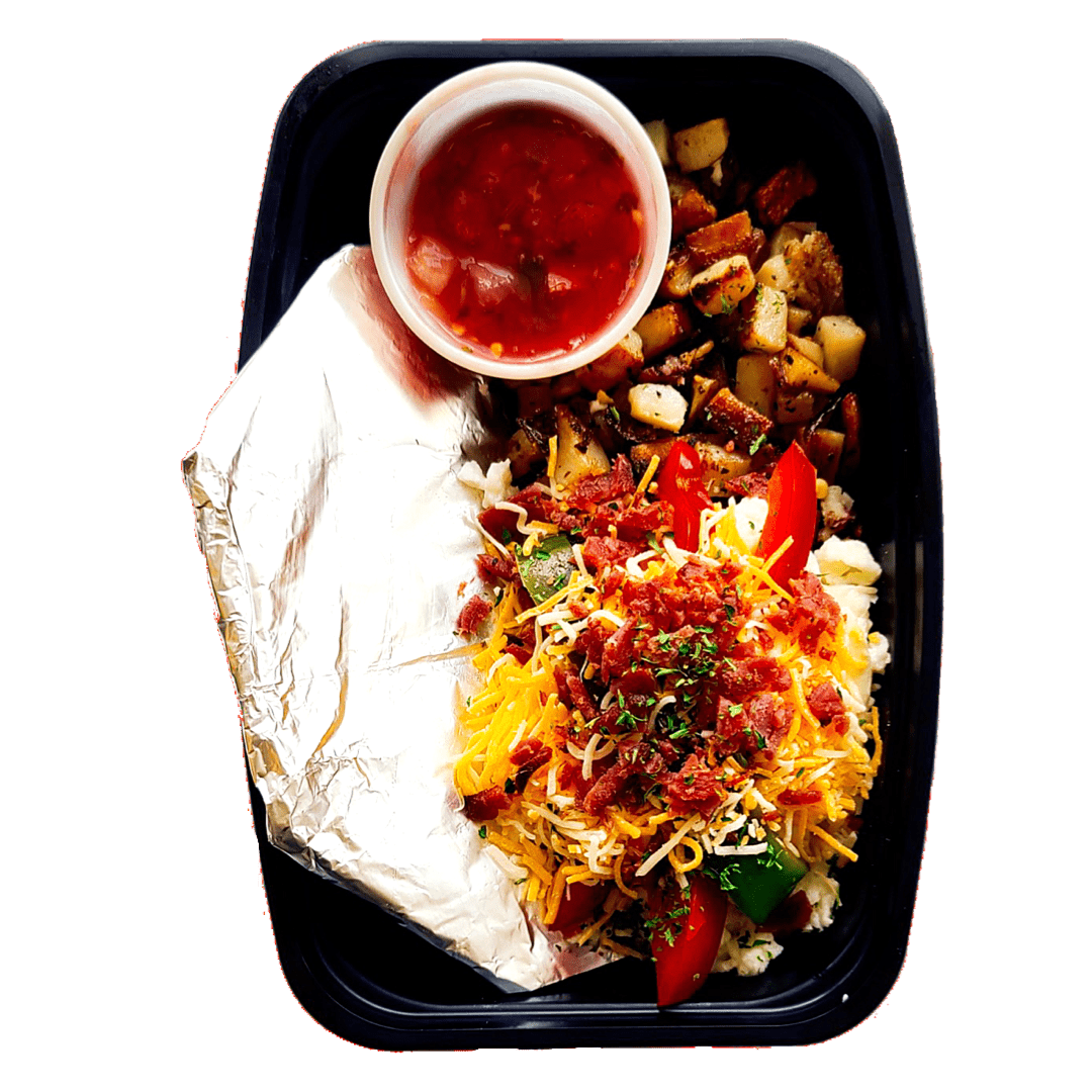 2 whole wheat tortillas ready to packed with egg whites, turkey bacon, turkey sausage, fresh bell pepper, cheddar jack cheese, and home fries. Then top your tacos off with delicious pico de Gallo.