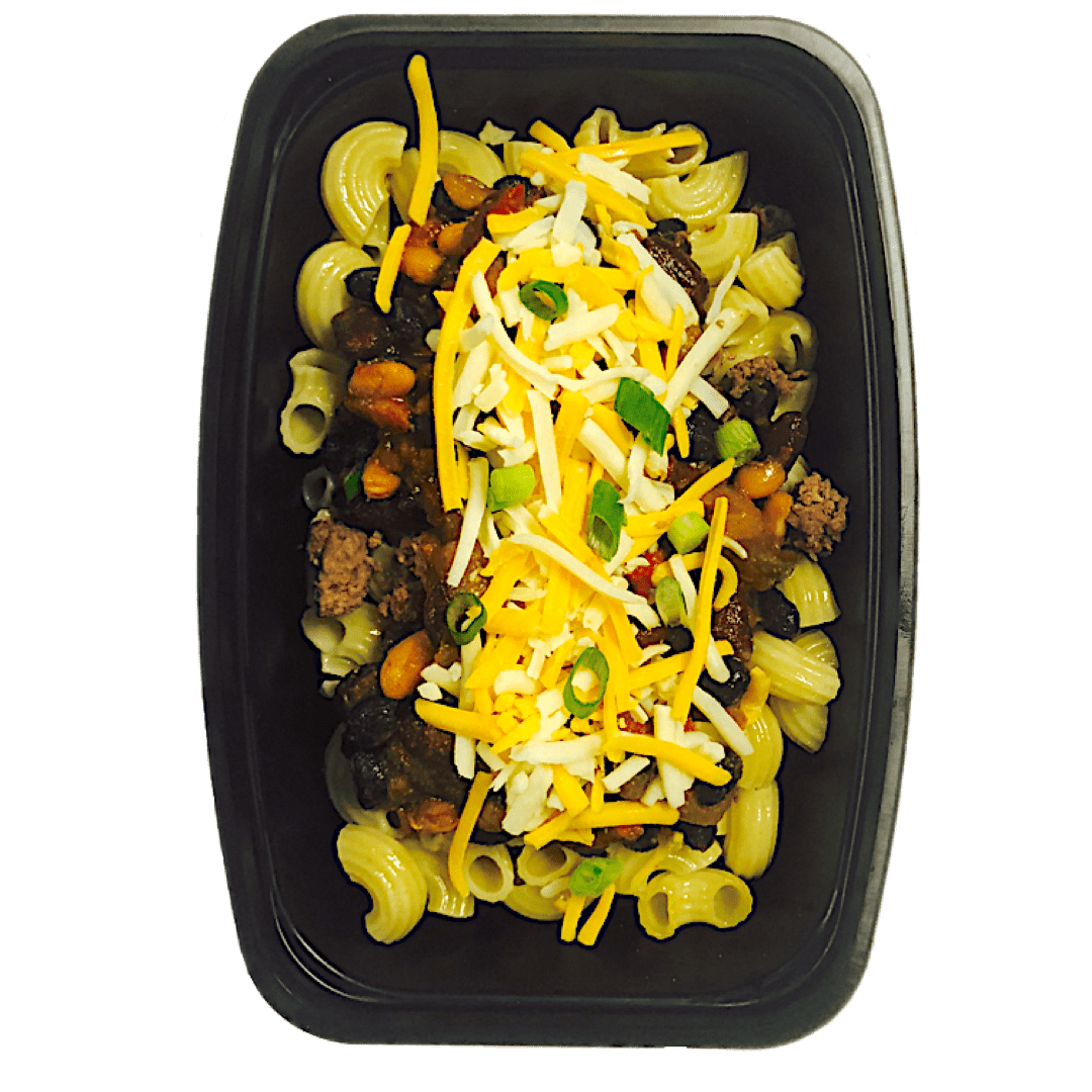Ingredients: Elbow pasta, lean ground beef, kidney beans, pinto beans, tomatoes, green chilies, onions, bell peppers, chili powder, cumin, brown sugar, garlic powder, and sea salt