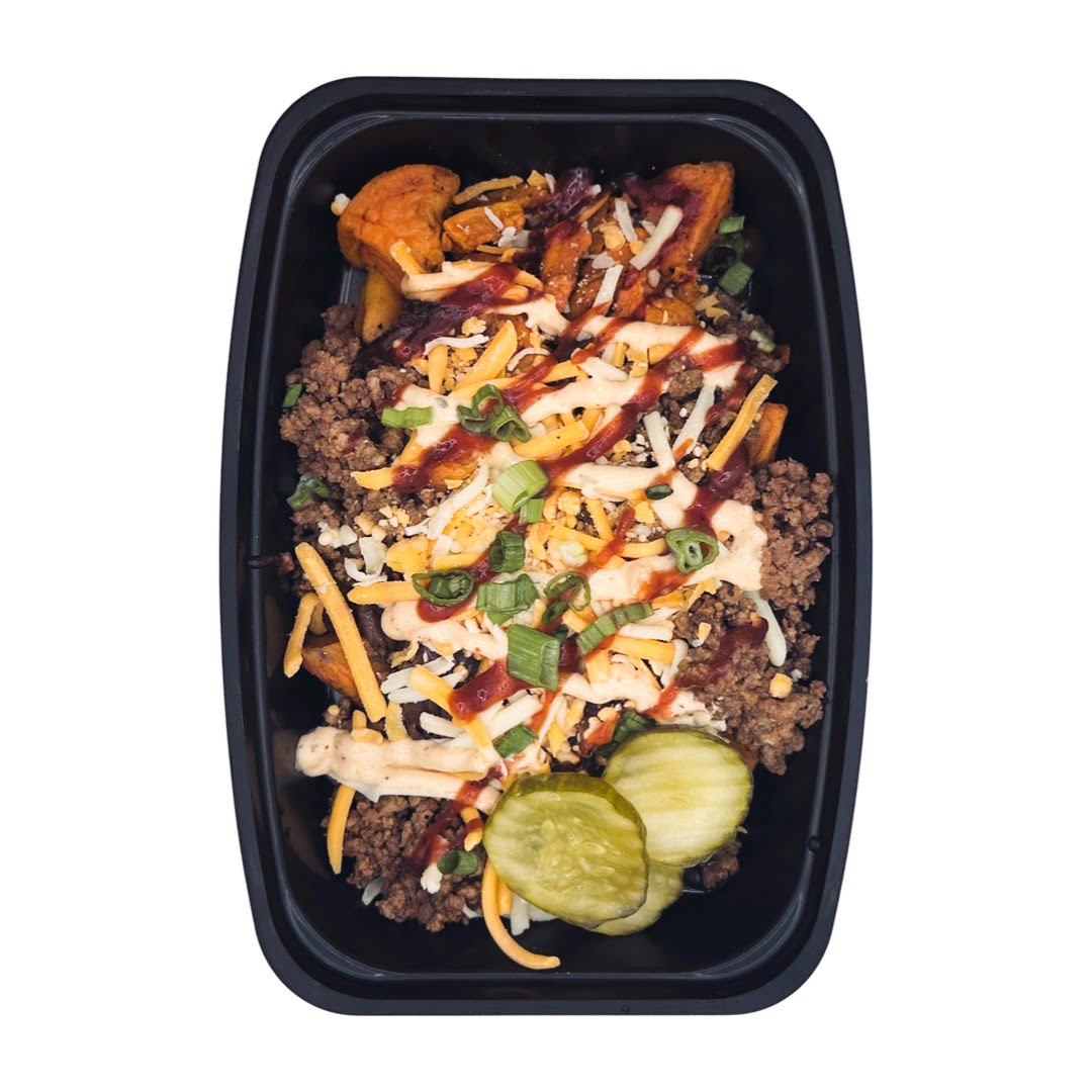 The cowboy burger bowl is a bold, southwestern-inspired dish with roasted sweet potatoes, BBQ seasoned ground beef, caramelized red onions, and crispy bacon. Drizzled with tangy BBQ sauce and a chipotle sauce. Then topped with cheddar jack cheese. With a side of spicy maple bourbon pickles to add a sweet-tangy kick for a hearty, flavorful bite.
