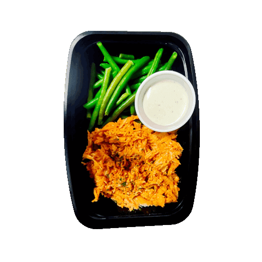 Seasoned and shredded chicken breast tossed in buffalo sauce, served with long green beans and with a side of ranch. For anyone looking to cut their carbohydrate intake, this delicious meal is sure to please.