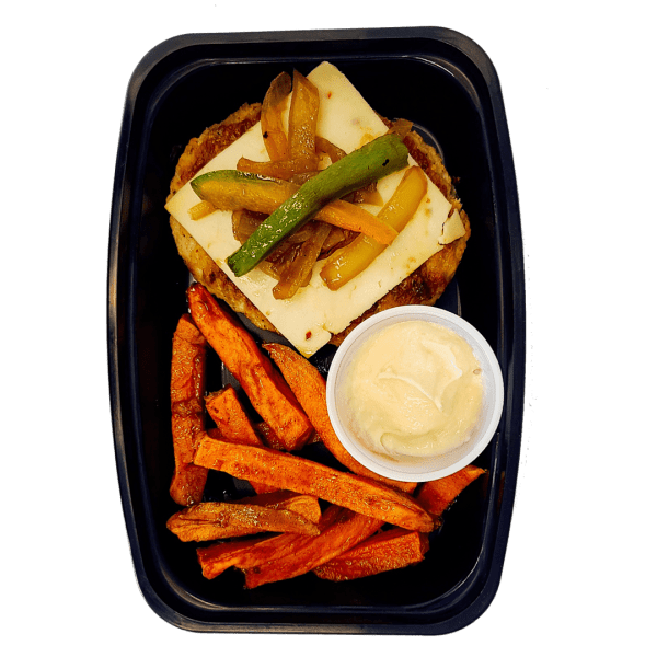 Ingredients: Turkey burger, sweet potato, pepper jack cheese, onions, bell peppers, light mayonnaise, sour cream, chipotle pepper with adobo, garlic, lime, paprika