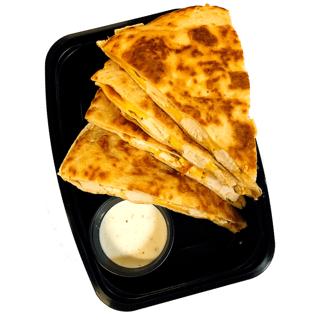 Chicken breast diced and packed into a quesadilla with pickled jalapeños and cheddar jack cheese dipped into low-fat ranch.